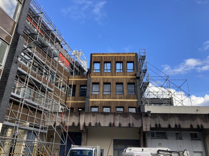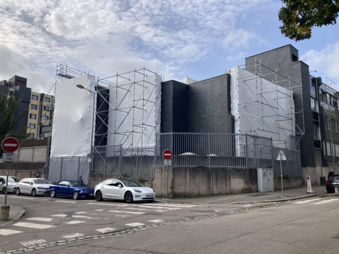 Enfin, un défi technique majeur réside dans l’intégration des nouvelles façades entre deux espaces bien distincts : une zone déjà rénovée et une autre encore ancienne et toujours en fonctionnement.